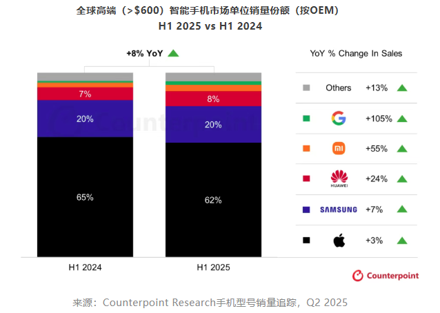 苹果(Apple)在上半年仍然是最大的品牌,同比增长3%,在高端市场份额达62%。但由于其他OEM厂商增速更快,苹果的份额有所回落:其在新兴市场的表现提升,但在中国被华为与小米蚕食。凭借忠诚用户群与强大的线下覆盖率,华为在中国仍极具吸引力,并通过诸如三折叠Mate XT等独特设计机型,不断收复份额并赢得消费者的青睐。