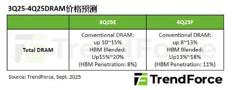 根据TrendForce集邦咨询最新调查,由于三大DRAM原厂持续优先分配先进制程产能给高阶Server DRAM和HBM,排挤PC、Mobile和Consumer应用的产能,同时受各终端产品需求分化影响,第四季旧制程DRAM价格涨幅依旧可观,新世代产品涨势相对温和。预估整体一般型DRAM(Conventional DRAM)价格将季增8-13%,若加计HBM,涨幅将扩大至13-18%。